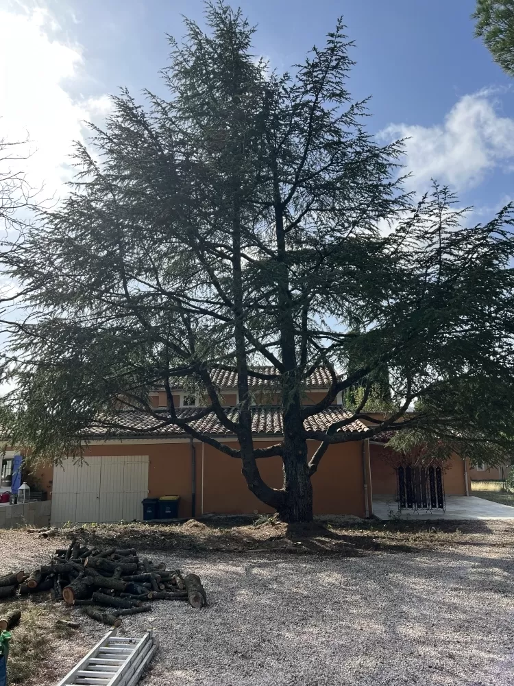 Votre élagueur à Brignoles, a effectué la taille du bois mort et suppression de branches indésirables sur un cèdre, les lauriers-tins ont été supprimés pour aérer le massif.
